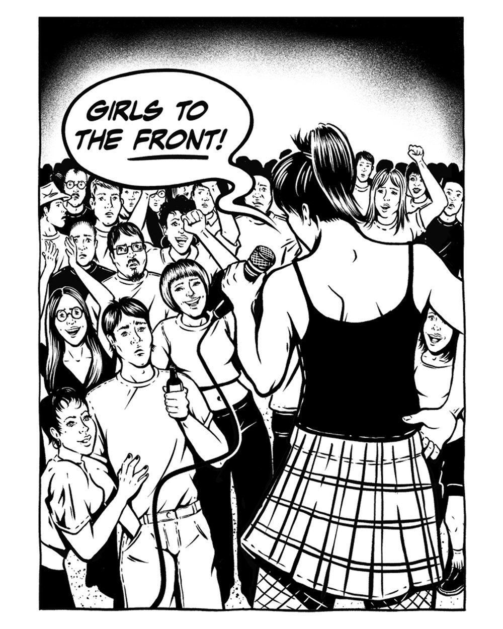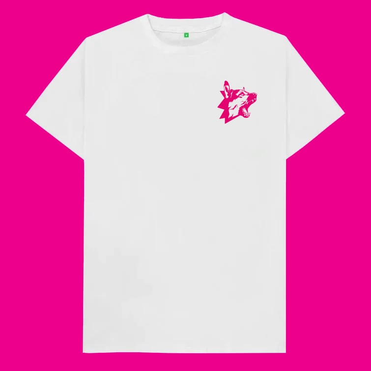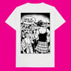 Girls to the Front! design by Cat Sims. Back print tee with Dog Section Press logo on front.