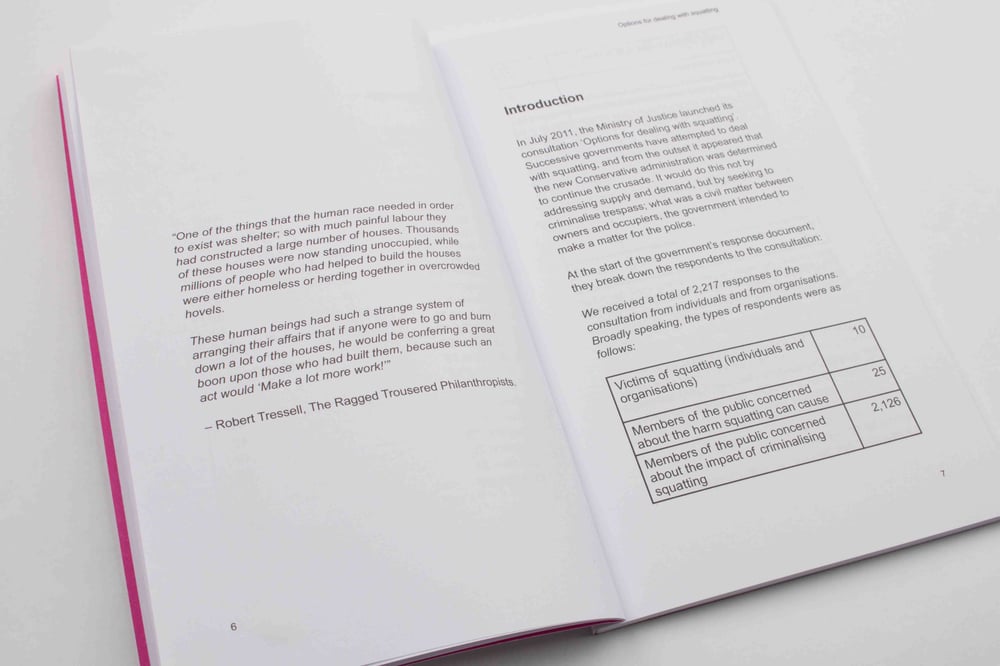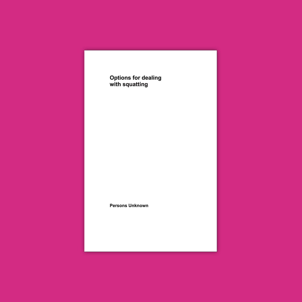 Options for dealing with squatting is a collectively authored book of responses to the Ministry of Justice's consultation of the same name. It draws on the tradition of collective authorship (Karen Elliot, Luther Blissett, Wu-Ming) to examine practically the philosophical question of individual ownership.
